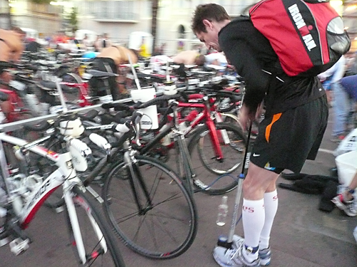 2500 triathleter som pumpar cyklar och fixar det sista inför start. PANG hördes i området och en slang smällde. Någon stackare som var tvungen att börja dagen med att byta tub på cykeln.
