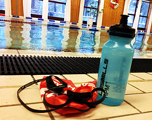 Annars och i övrigt så simmade vi som fram och tillbaka och gjorde en massa övningar. Som att ta färre och färre andetag för varje längd. Och att simma 10*50 meter fort med starttid 58 sek. Och så hade vi en platta mellan benen som skulle vara still medan vi simmade med breda armtag fram och tillbaka, fram och tillbaka …